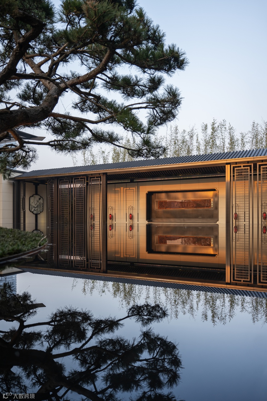 前场沿袭规制严谨的府邸礼序,首先映入眼帘的是端庄大气的宋式大门。门前御道参照宋画精心设计,以藕花为主题。两只紫铜对狮端坐于大门两侧,家国神兽显王者气势,细节做工呈御贵风范。