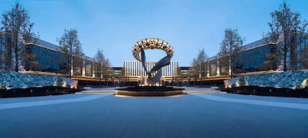 作为场地核心的大面积水景以宝石为形,用精细的工艺表达水动与静的美妙。高高矗立在水景上的大雕塑,作为城市界面和场地视觉中心的同时,也无不体现出奢华归家的礼仪之感。