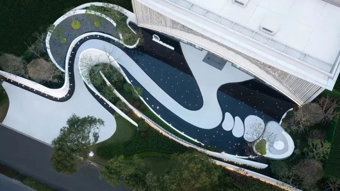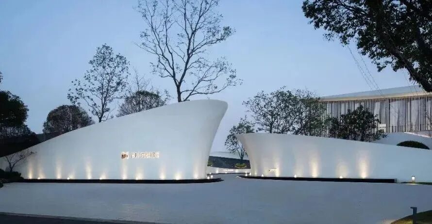 一艘巨大的游艇停靠在水面之上,与日月湖遥相辉映。大门设计从游艇造型抽离简化,提取独有的流线感及线条形式,向两侧延展,以建筑的层层线条,将大门的语言与建筑相结合。