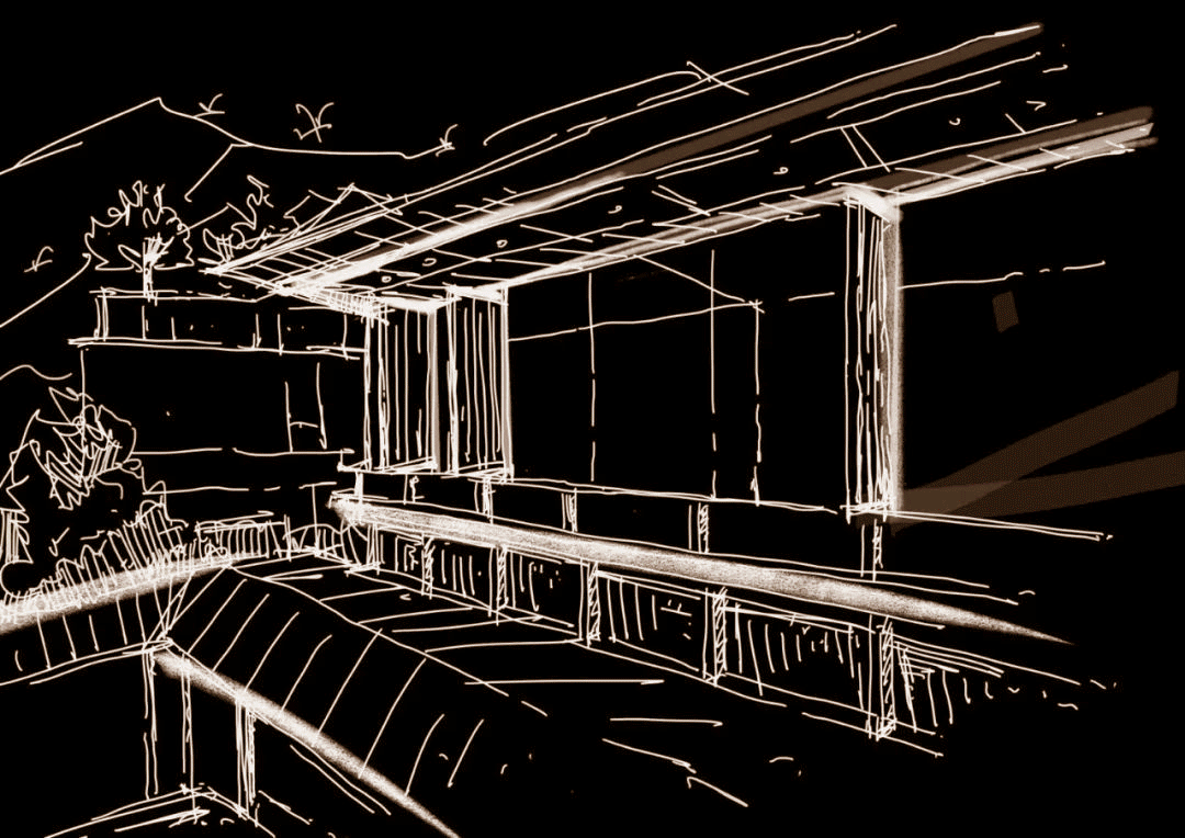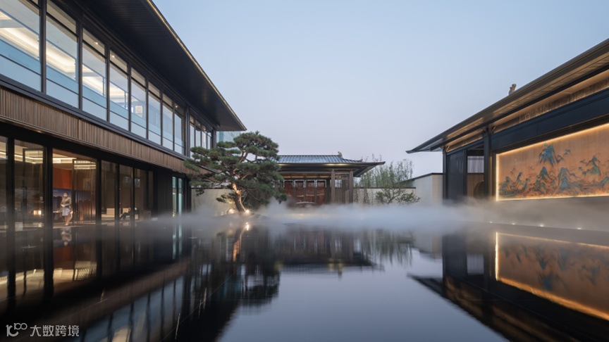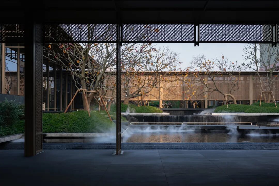 以景观为底,通过大面积的水景,托起建筑这艘船;以深色的弧形墙面,消解架空层原始结构的刻板,同时整个架空层采用下小上大的维护装饰,让整个一层“消失”在环境中,进而让二层的建筑仿佛飘在空中;配合景观雾气的设置,真正实现“舟泊烟渚”的意境。