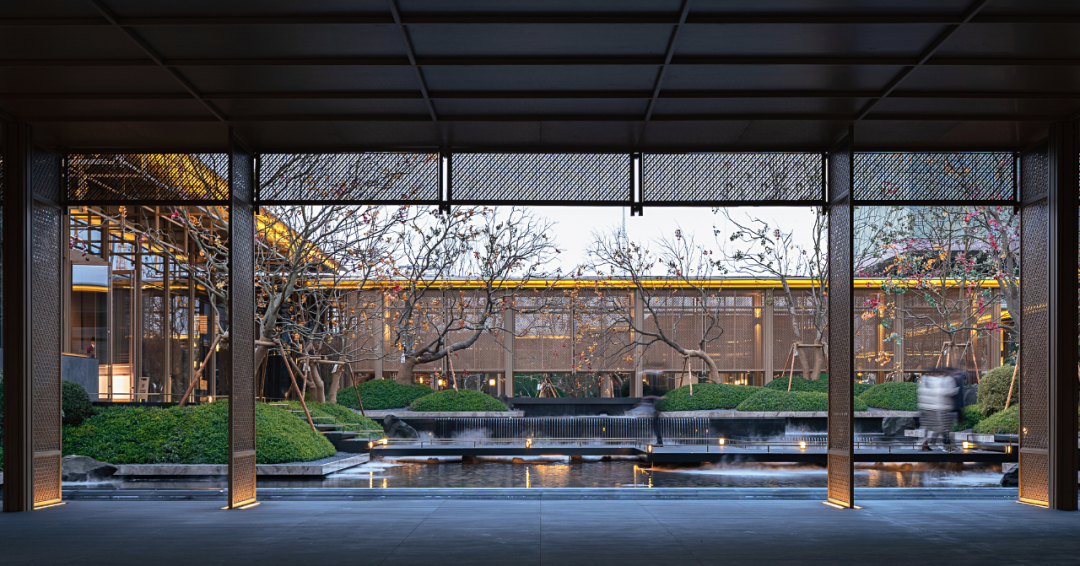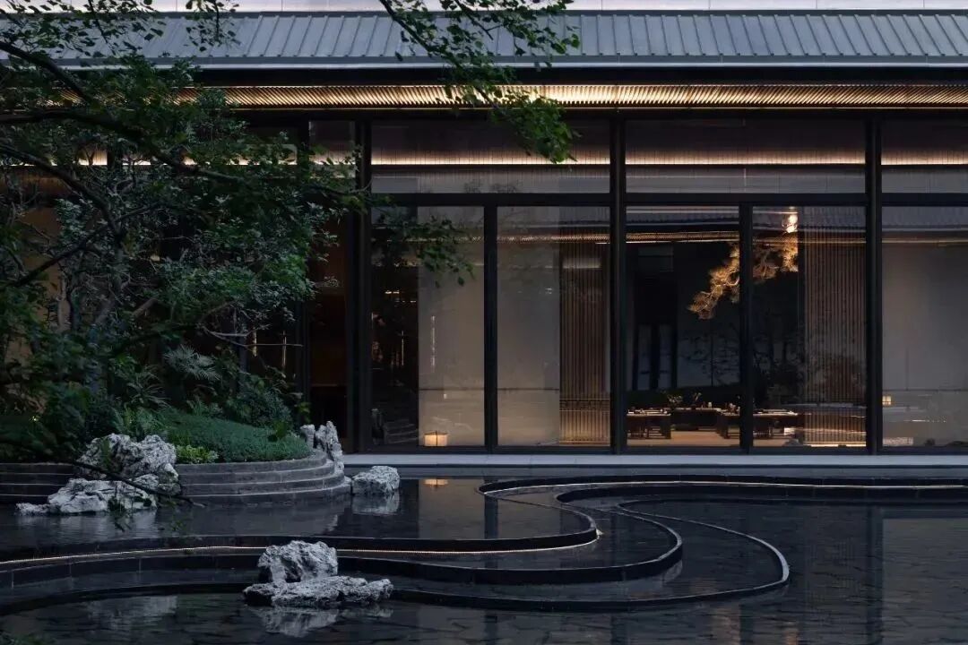 官式唐风入口大堂,自然写意、仪门入画、松石迎宾叠山流水,绿林环绕,青松凛立仿佛带人穿越于古代名园庭院之中,让人流连忘返,山川溪流、月下吟歌、听禅饮茶、便是文人雅士隐世闲居时最风雅的生活,水底点点灯光犹如璀璨星空,亦境亦动,宛若星辰。