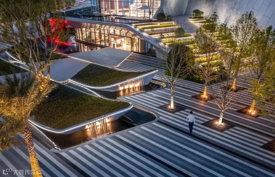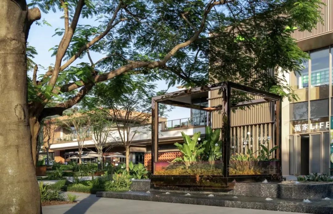 街道与商业的拓补融合,重新定义空间尺度,水景上金色的礼物盒子的艺术演绎,打破了空间界限,构建一个自由未知的空间,同时设计师因充分尊重原生场地,保护现存大乔,极力保留原生态,做最自然的景观。