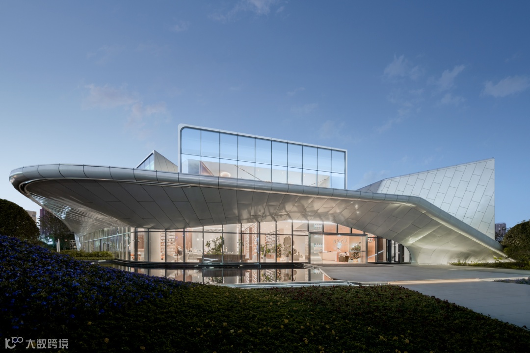 建筑立面取意“舟泊烟渚”之“舟”,以玻璃幕墙与金属线条共同勾勒出建筑的整体形象,流线型的形体关系流畅舒展,展现了自由的后现代建筑风格,打造出一个极具未来、科技感的示范区。
