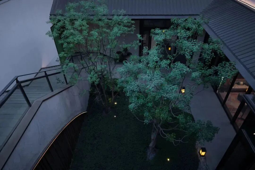 空间的切换,是情感的调动与转换。内场建筑原设有天井,景观借势打造多维度L型水景,营造室内外共享的下沉空间,同时展示了空间竖向艺术。