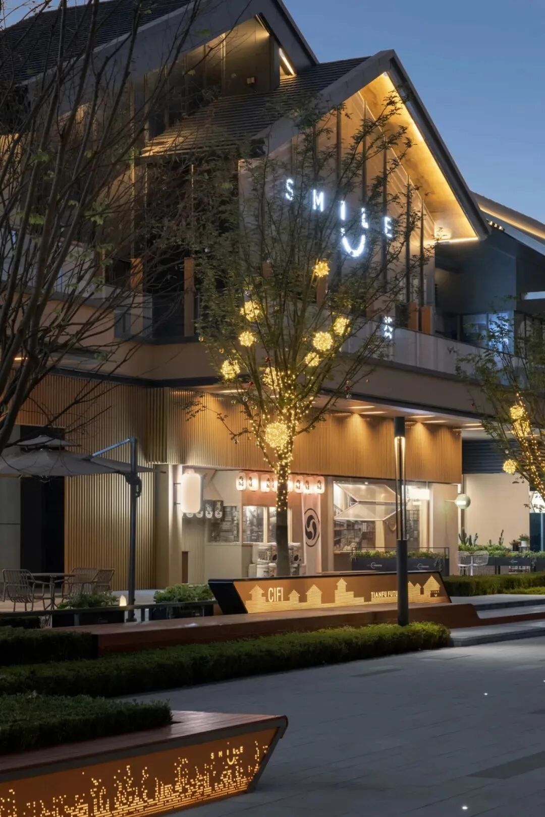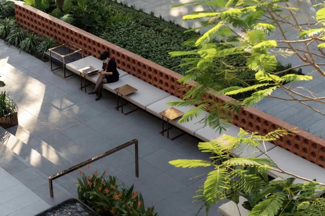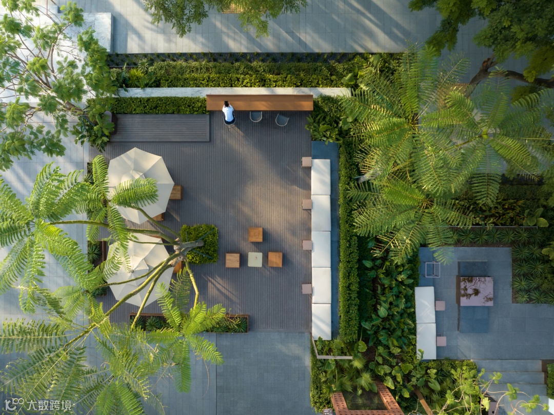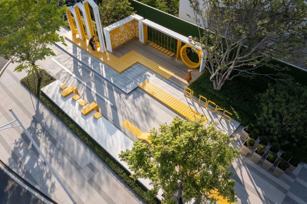 有趣的花园渗透商业、链接城市,大家都可以以自己的方式参与进来,木平台围合起林荫下的交流空间,灌木与乔木灵动穿插其间,承载着宠物友好、休憩、会客社交等多重功能。