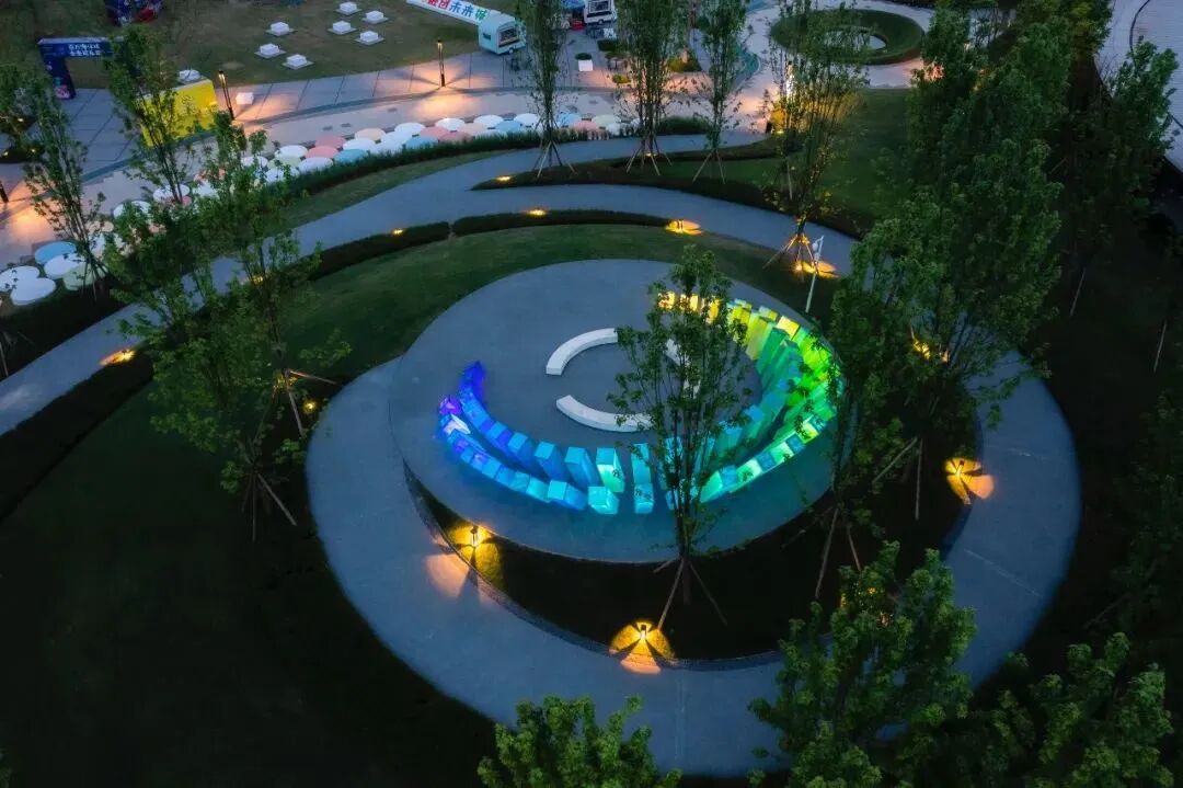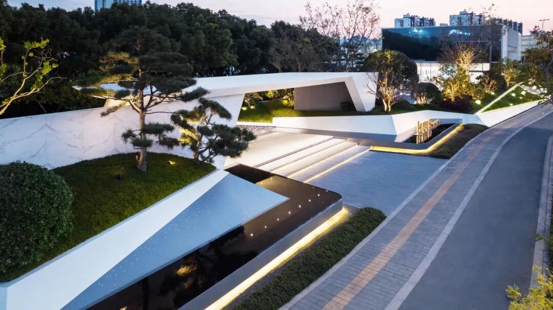 背景香樟林、前场的浅水面与折叠白亭互相交织掩映,平台之间错落穿插咬合,在茂密的树下交融渗透,构筑出现代艺术与闲适自然相得益彰的场景。