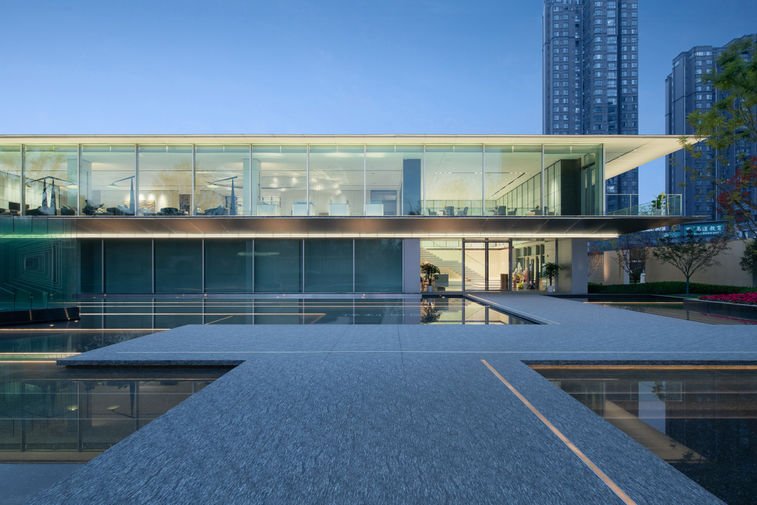 景观及建筑融入“悬浮”灵感,通过界面昭示性、视线穿透力和悬浮生态系统的植入,在现代风格的主导下,以“浮岛—浮窗—浮光—浮镜”作为空间的场景引导,营造一场丰富的空间体验。