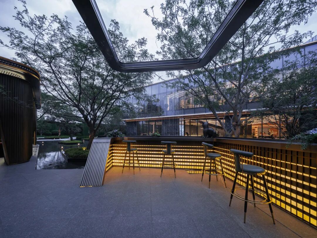 在社区内部,设计以舒朗有致的空间尺度,结合绿植,平衡视觉美感与实用性;设置花园会客区、主会客区以及室内外吧台区等不同会客场所,为未来社区开展小型论坛、品酒会、花艺等活动提供更多的可使用空间,承载更多的邻里温情。