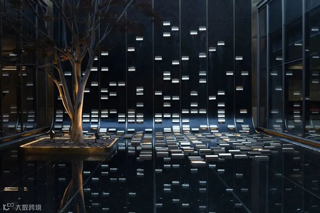 设计将灰空间以酒店橱窗的方式打造,双鹰宝仕前庭形成了有极强对称感、秩序感的专属仪式空间,运用精美工艺装饰设计展现秩序中的艺术。看似平静的水面缓缓汇入细渠中,水景池底将宝石切割的方式延续。