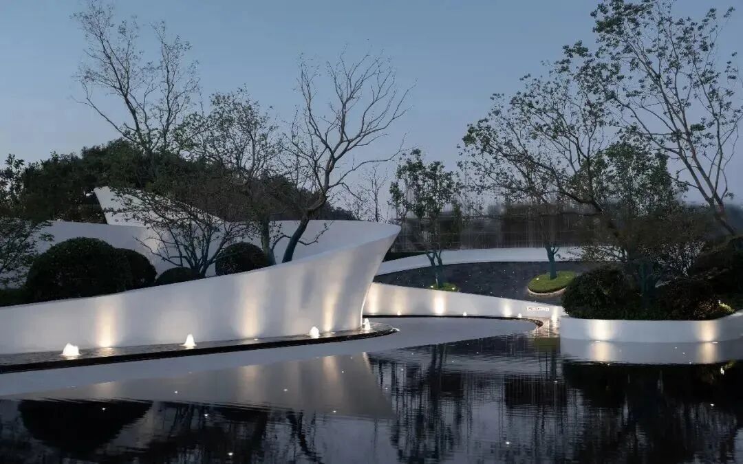 为了避免较大的高差给前场空间带来的压迫感,水景的材质我们选用白色大理石与景墙呼应,使空间呈现纯粹、轻盈的美感。