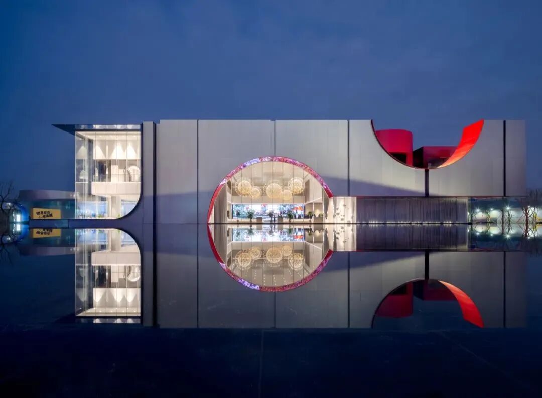 色彩冷冽的金属建筑仿佛浮于水上的科技方舟,流畅的线条彰显动感的时尚,构成对场所空间和城市道路转角处的巨大张力和识别性。