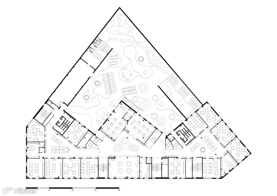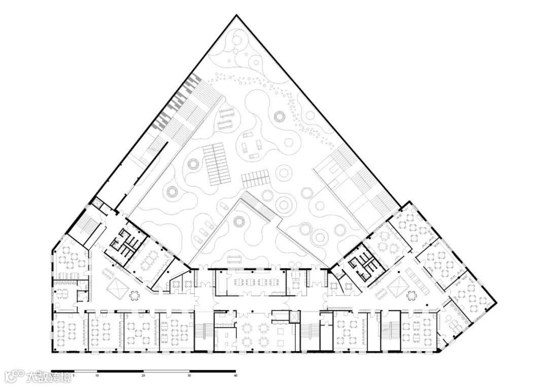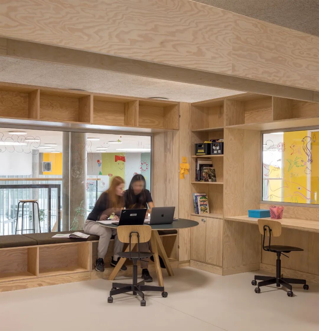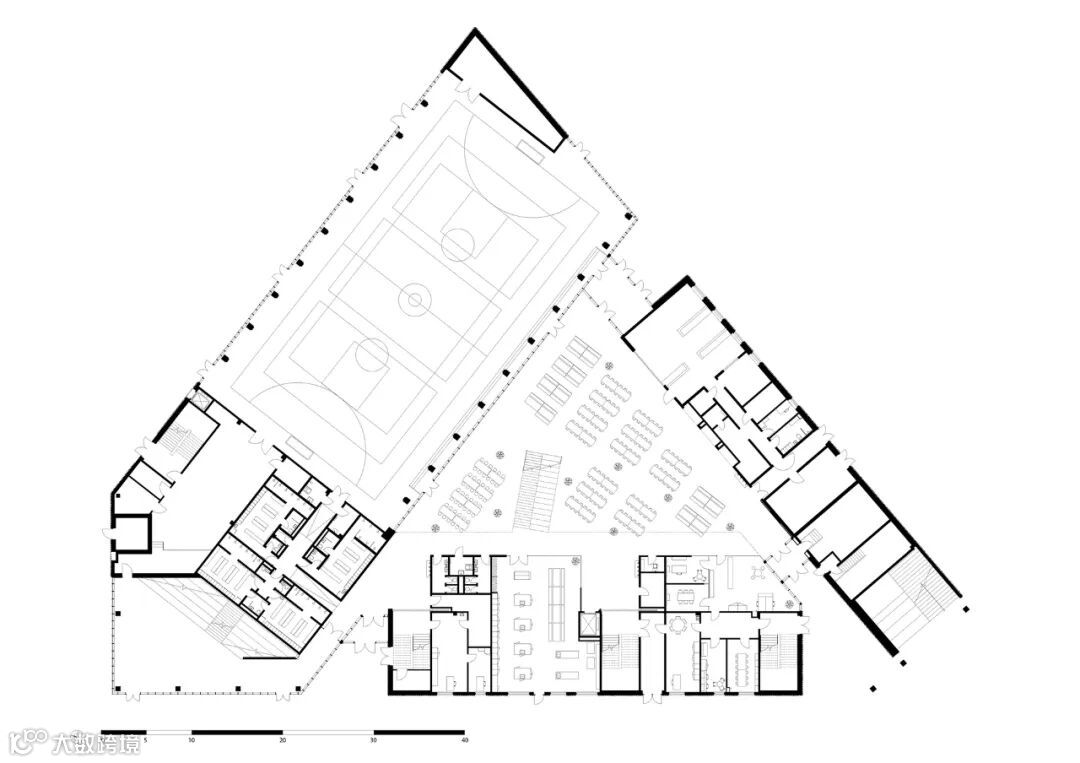 由于食物是学校特征的一个关键因素,因此餐厅是中心房间。双层高顶的餐厅不仅是食堂,也是连接学校所有功能的枢纽。这使得食堂成为学生们可以在学校众多活动中聚会的地方。