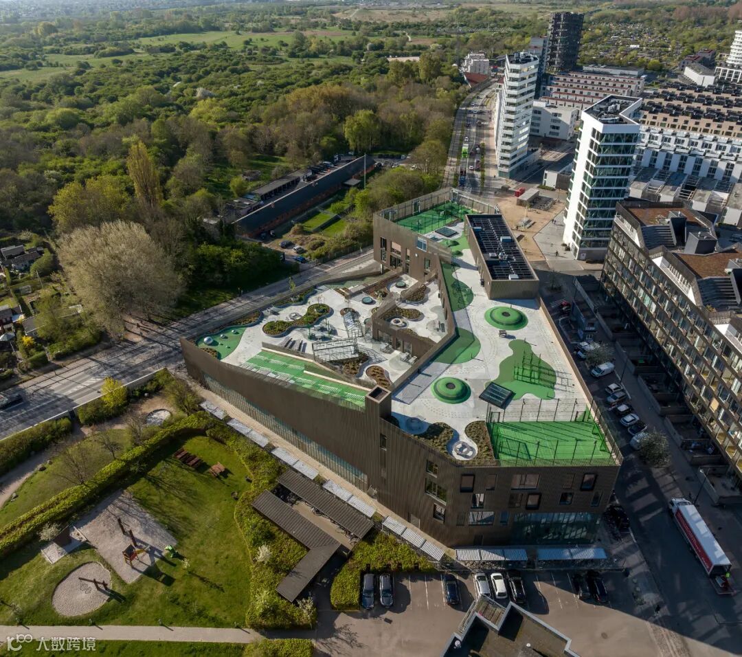 The school's interior and outdoor spaces are designed to be in close contact with each other. Each class, therefore, has direct access to the rooftop landscape, while the school's natural science area is connected to a rooftop zone with a biology garden, a hothouse for physics and chemistry, and gardens that are used in cookery lessons.