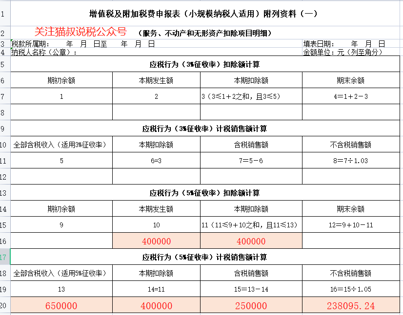 案例一:假设按季申报的三哥小规模劳务派遣公司,2023年2季度提供劳务派遣服务,取得含税收入650000元普通发票,其中代用工单位支付给劳务派遣员工的工资、福利和为其办理社会保险及住房公积金共计400000元。