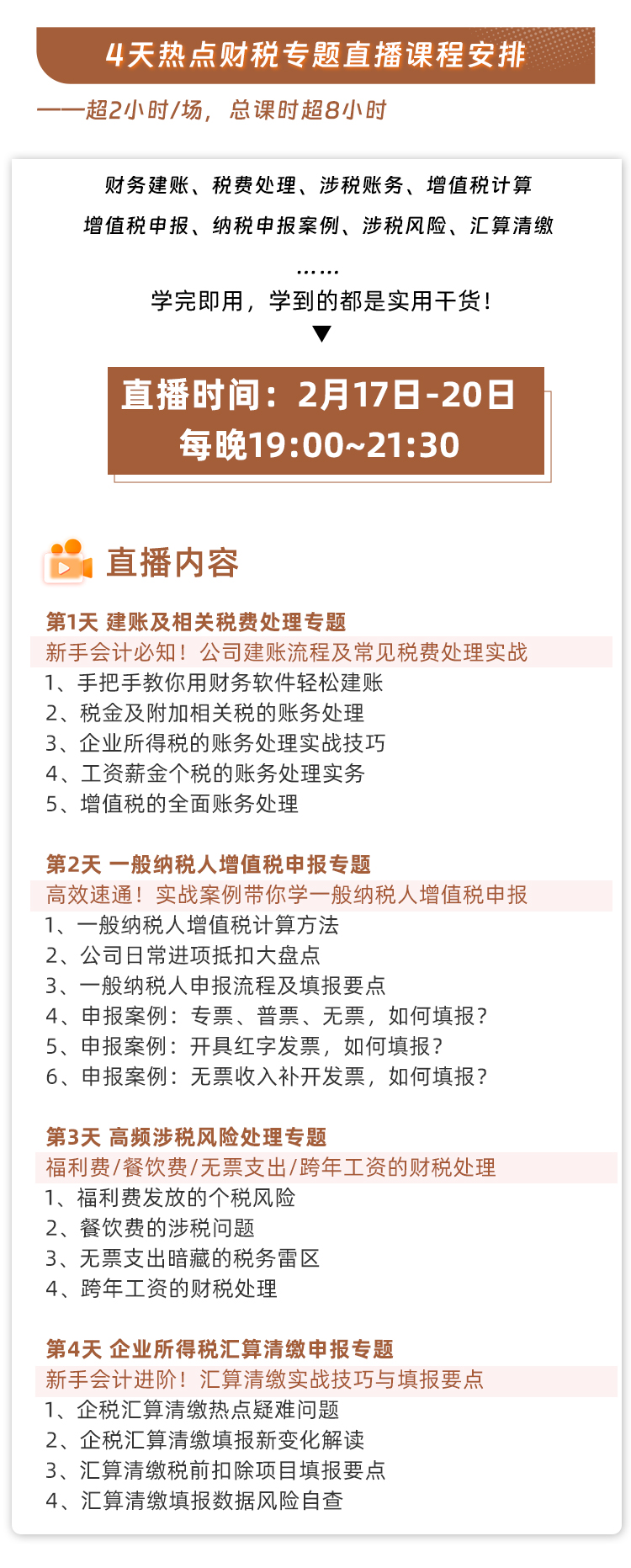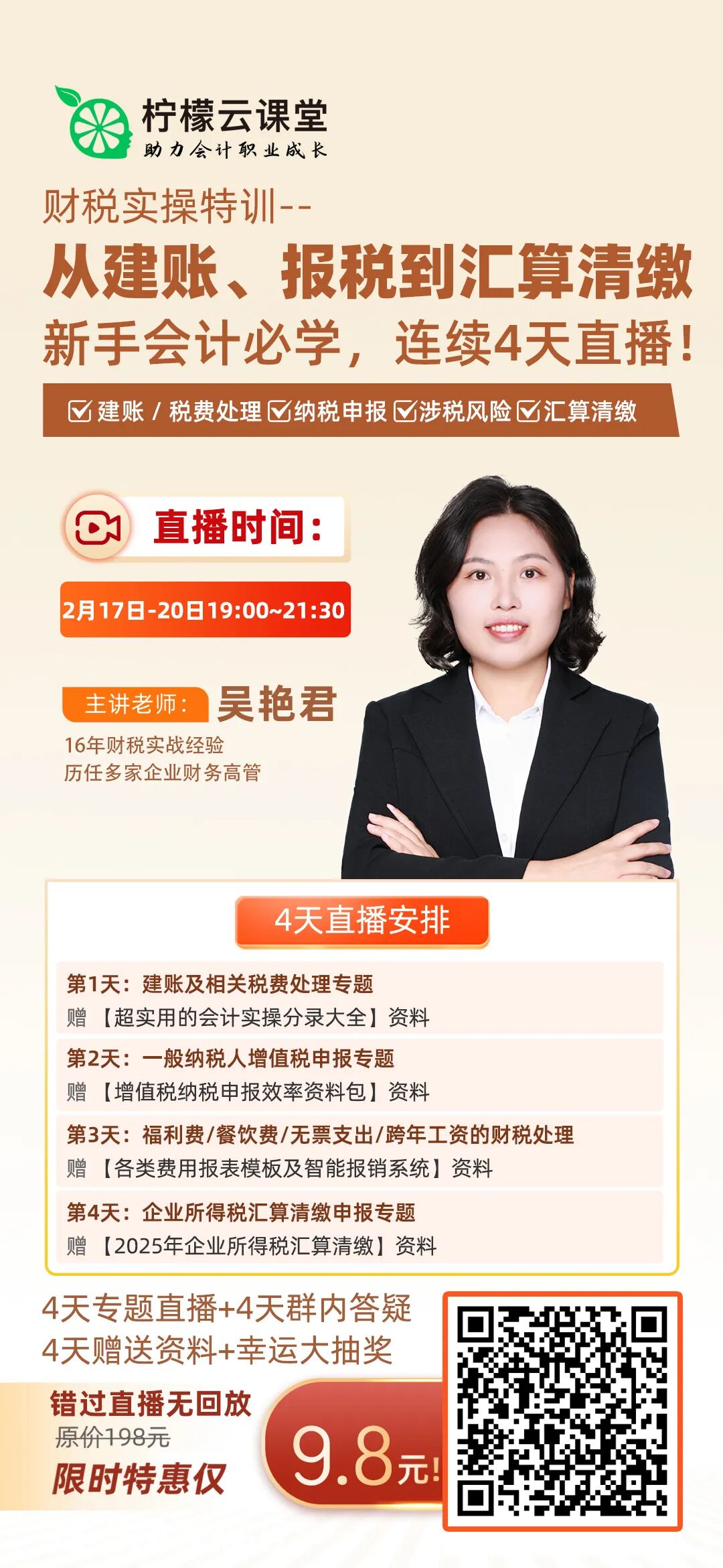 千万被错过这一次的《财税实操特训--从建账、报税到汇算清缴》4天直播特训营,老师将带你掌握从建账到税务申报、再到汇算清缴等复杂财税问题的处理,覆盖企业财税处理的关键环节。