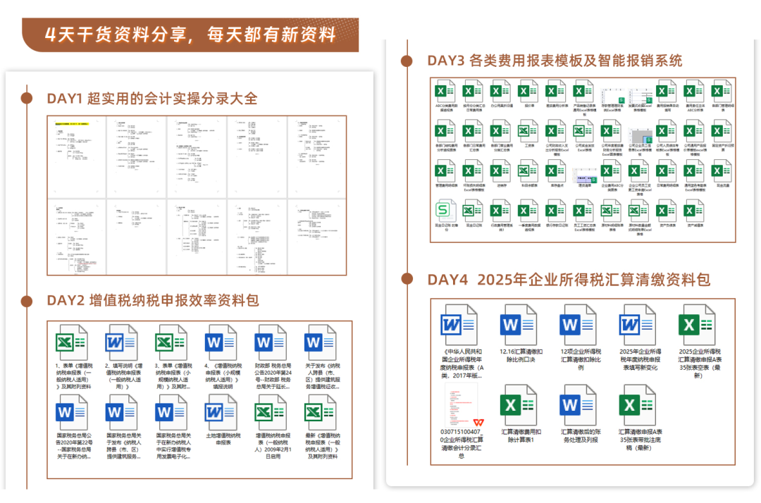 本次4天特训营不仅享受4天干货满满的课程学习,每天到课更有实用资料包领取哦,每天不重样,提升工作效率!
