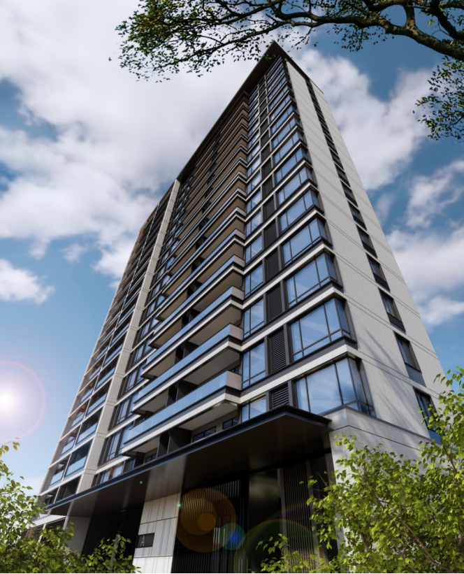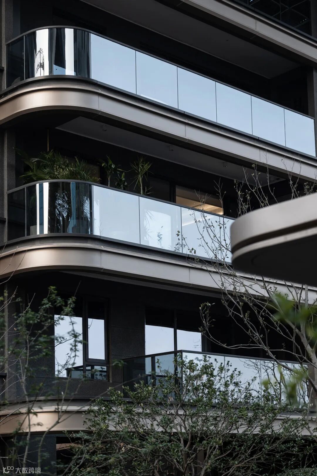 定制化的转角宽景阳台弧形玻璃与弧形铝板结合,提升产品外观质感及标志性。同时利用暖色铝板来打破石材的冰冷,给予温暖的视觉观感,以艺术弧线来赋予建筑的温度,灰色与香槟色的色彩体系碰撞出极奢的外观质感。
