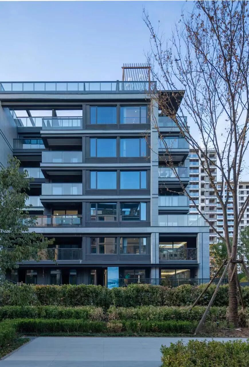 在知园的建筑外立面打造中,以大量LOW-E玻璃立面和转角窗打开室内视野,营造立面清透感;灰白色调为主的外立面整体时尚大气,与周边山林有了清新的共同色;通过玻璃材质、黑色铝材面与浅色仿石材面,让建筑表达出犹如黑白琴键的韵律感。