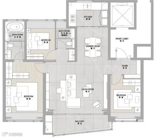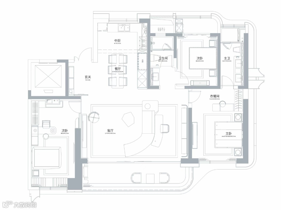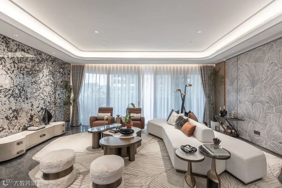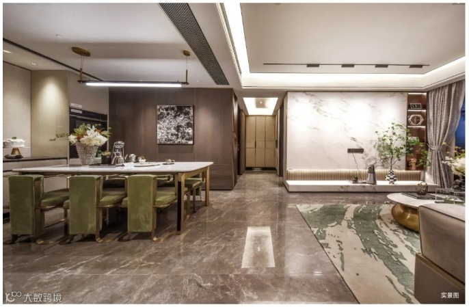 D10·天元户型采用了“超通厅”的概念,打造LDKG一体化设计(大平层豪宅的“大宽厅”一体化设计),这样不仅能让景观最大化、把落地窗外的视野最大化引入室内、动静分离,还充分打通室内公共空间,营造出了“会客厅”场景。