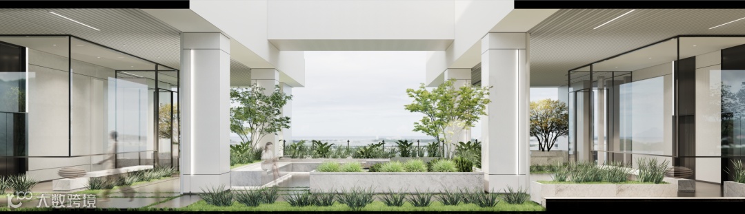 一体式异形超薄边连廊长达85米,做到了最轻薄和无缝,并与树池及建筑形成完美呼应。身居其中不错过山水自然,也不错过华丽人生归家。