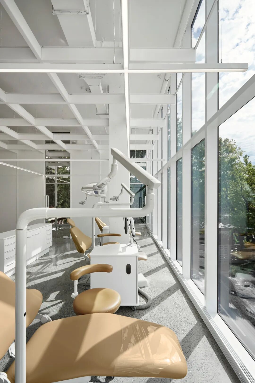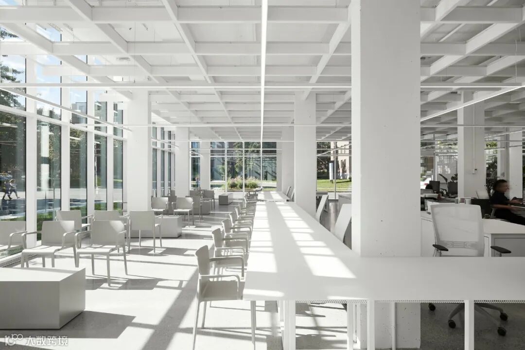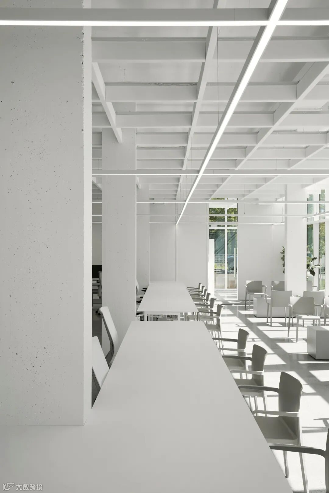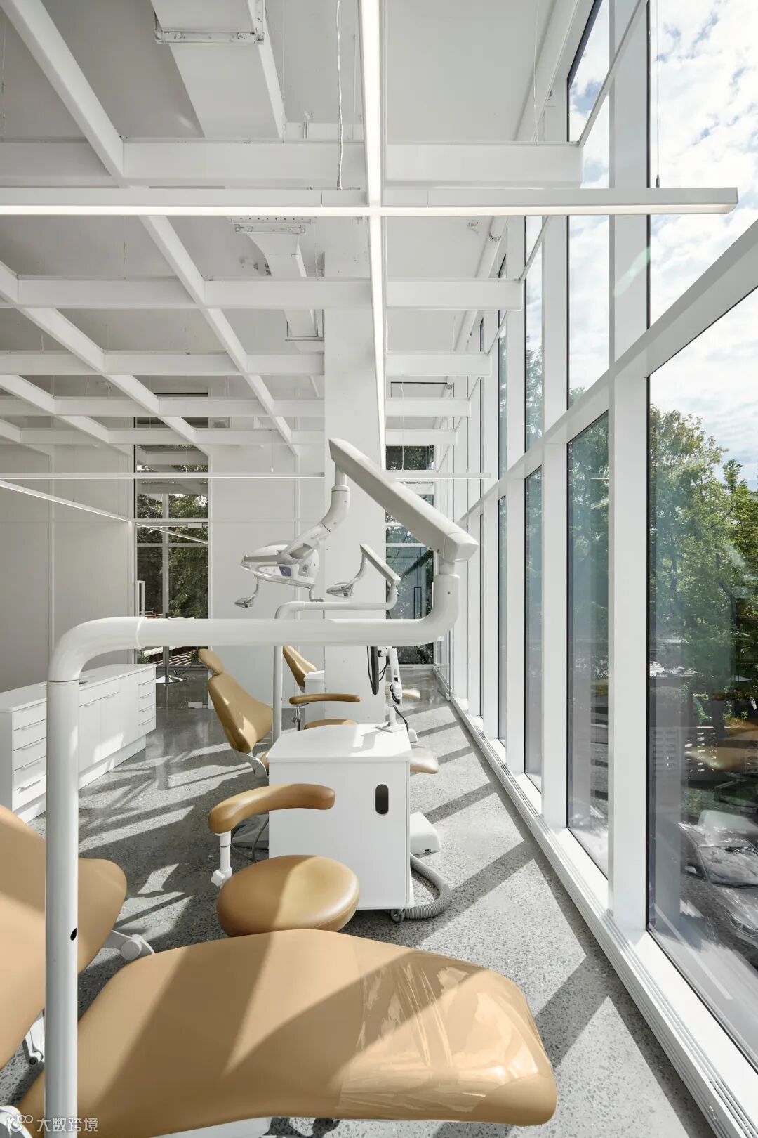 三十五个治疗空间的周边分布,都配备了最先进的设备和完整的无障碍设施,为每个病人以及诊所团队成员提供了与周围自然的视觉联系。结构、组织、照明和声学框架产生了一个有节奏的构图,结构的体积特性,同时用功能和审美特性的重复和叠加使其充满活力。