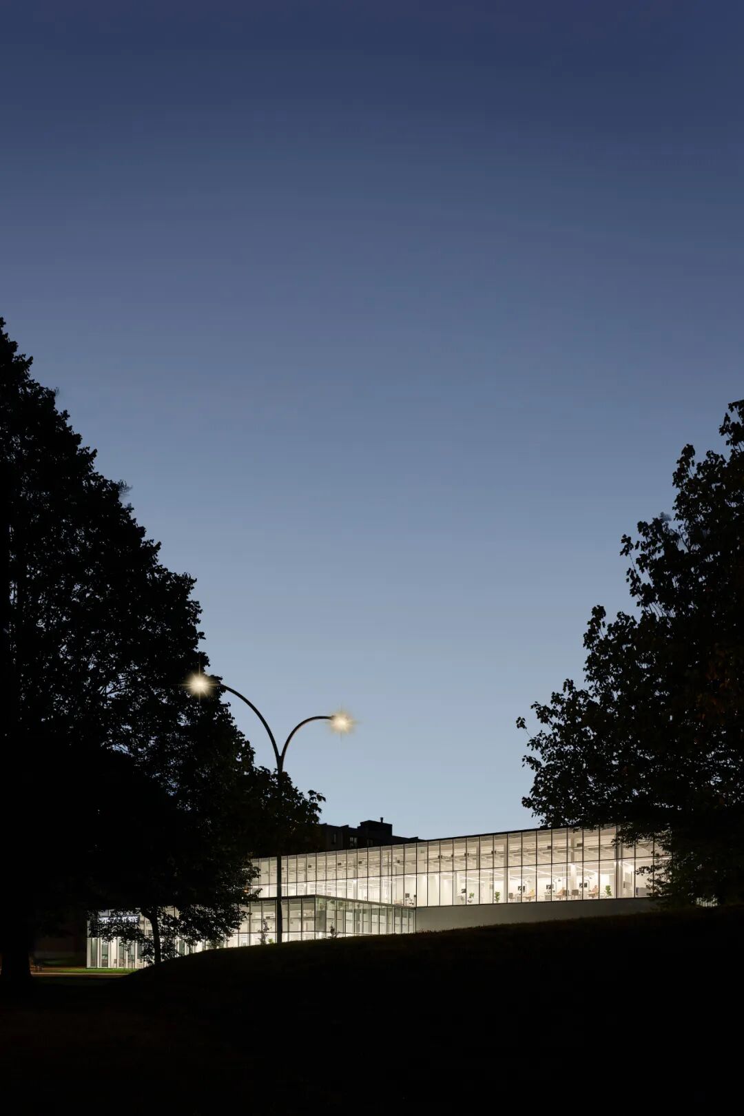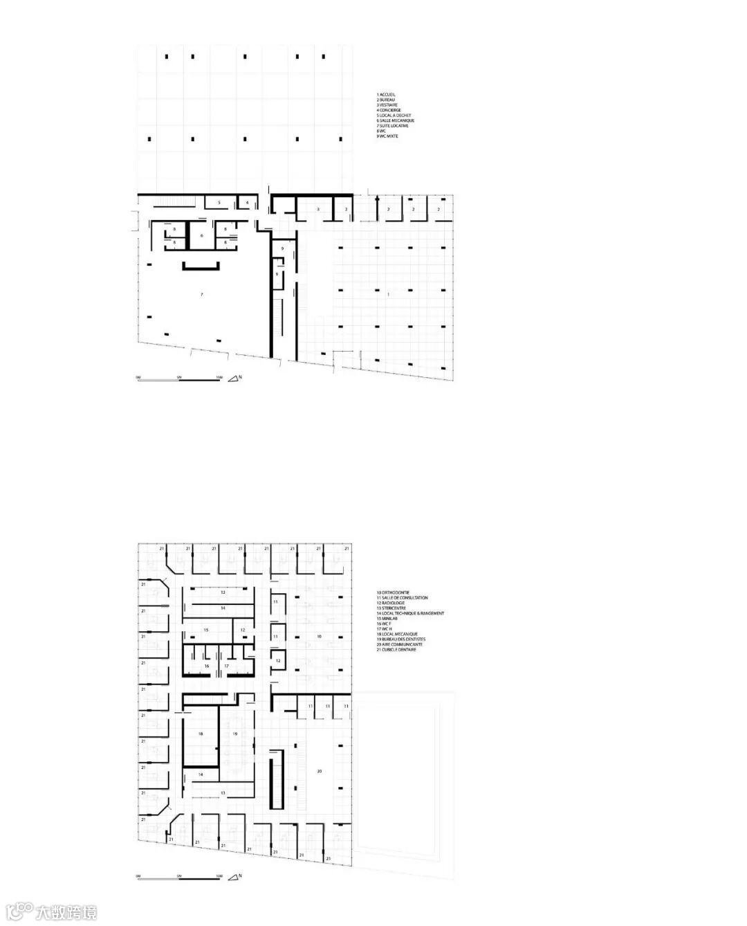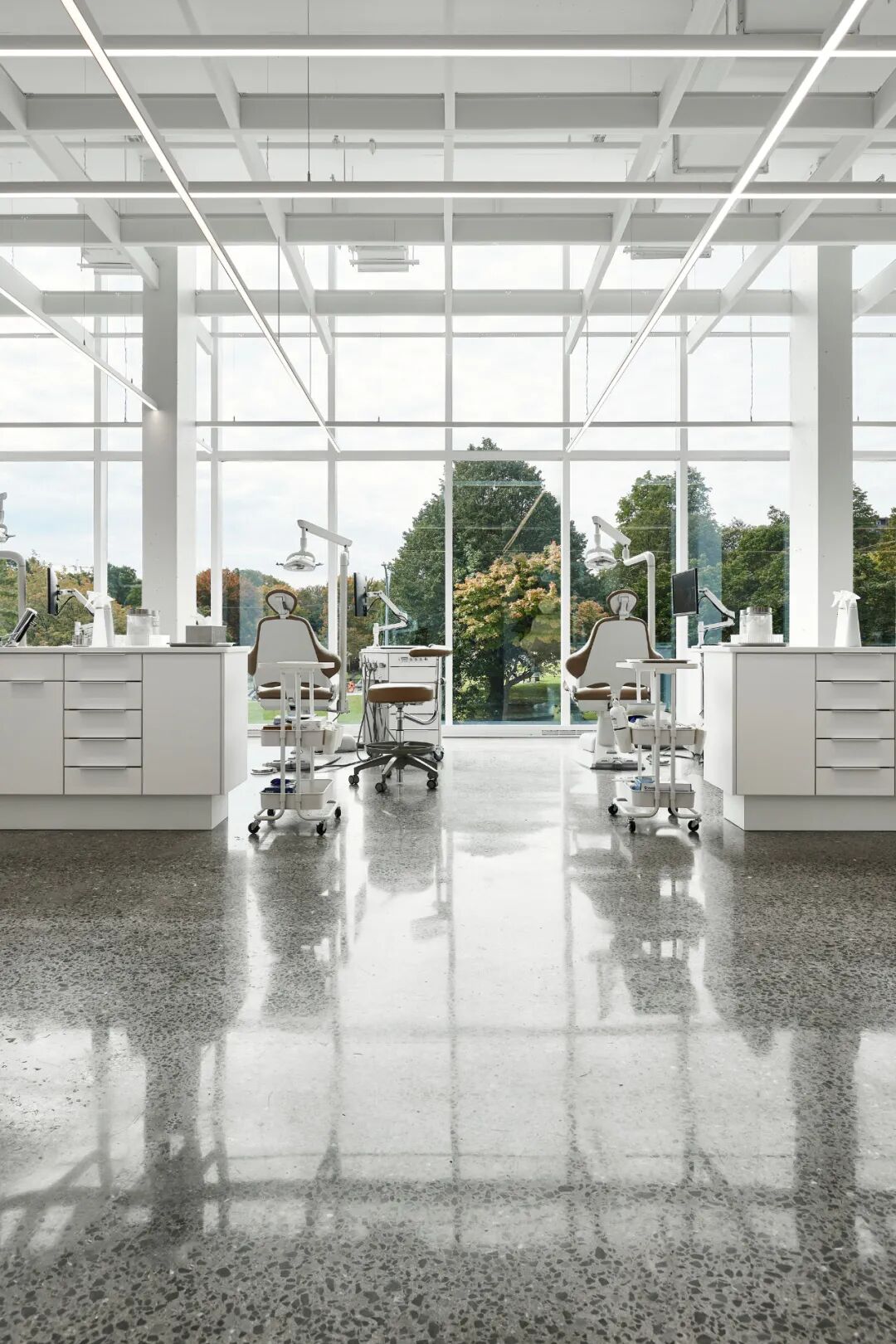 三十五个治疗空间的周边分布,都配备了最先进的设备和完整的无障碍设施,为每个病人以及诊所团队成员提供了与周围自然的视觉联系。结构、组织、照明和声学框架产生了一个有节奏的构图,结构的体积特性,同时用功能和审美特性的重复和叠加使其充满活力。