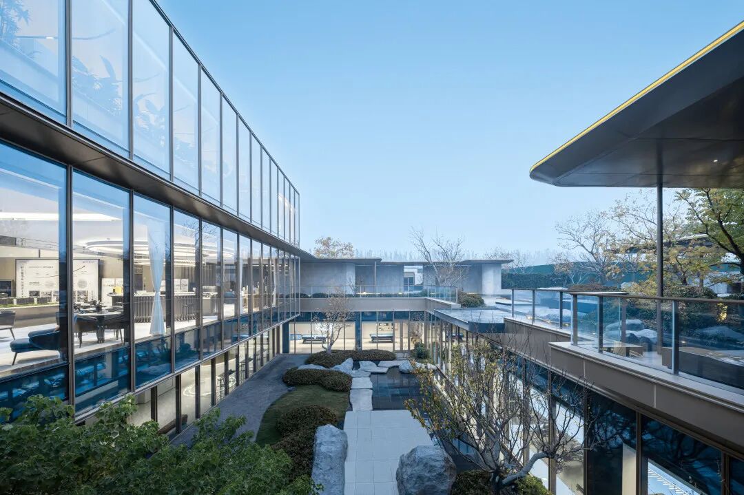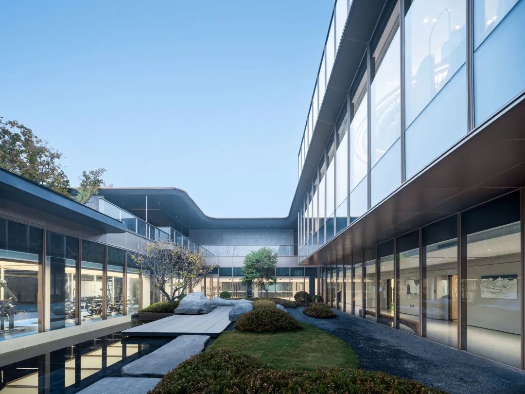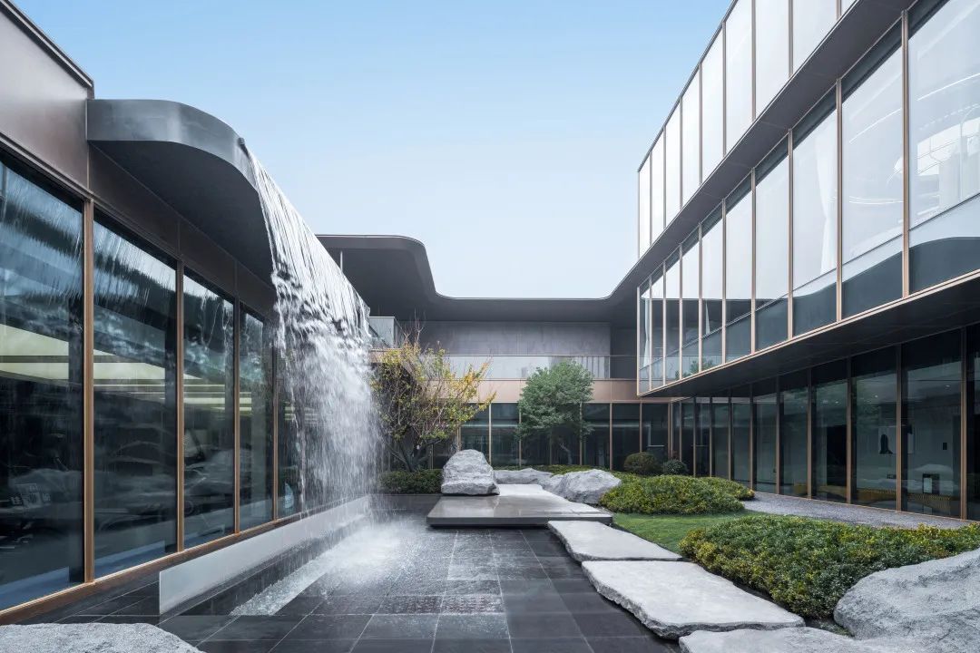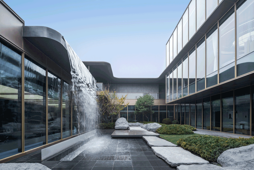 镜水延伸至连廊边沿,以黑金花岗岩和金属包边,弱化与地面的边界感,使得建筑、景观、室内相互连接,产生独属于场地的灵动感受。