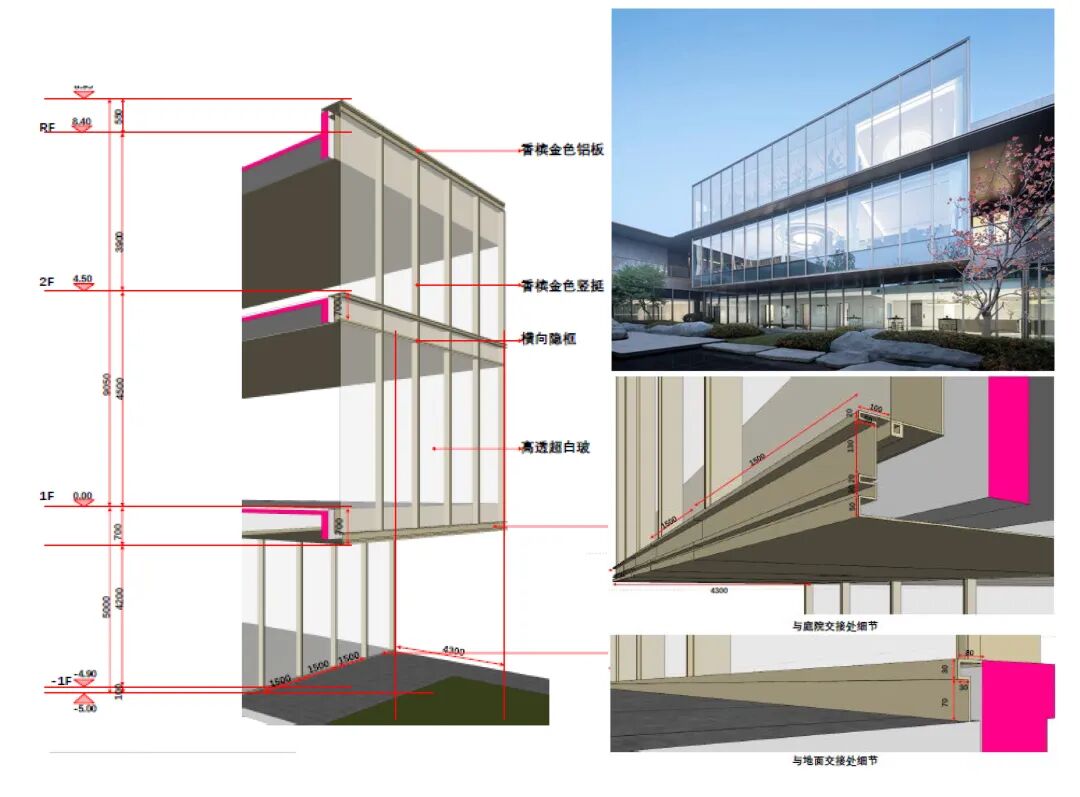 建筑背立面一二层打造一个通高透明的玻璃盒子,漂浮于下沉庭院上空,简洁通透的玻璃幕墙能够最大化的增加一二层室内空间的采光,同时保证了室内景观视野的延伸,模糊了室内与室外的边界,让室外美景引入室内。实现人与建筑、景观的融合呼应。