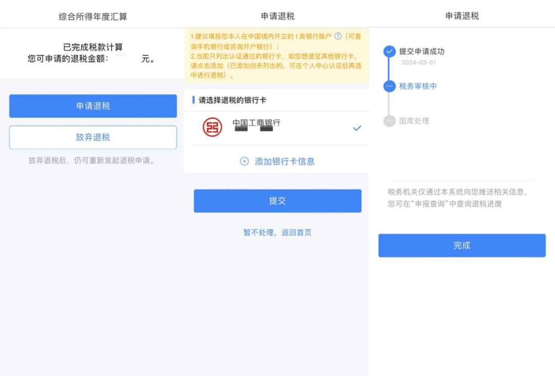 进入税款计算界面-申请退税-选择退税银行卡-完成退税申请
