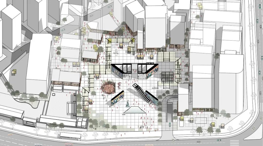 我们认为设计的首要工作是激活城市的空间,我们打开场地与城中村的边界,拉通与城中村联系的路径,在边界处设置共享长廊,把场地塑造为一个四通八达的口袋公园。新建建筑底部全部架空,放射形十字剪力墙结构让各个方向最大程度的开放。于是,场地成为了片区步行路径的交汇之地,也成为周边居民的户外活动空间,临近的居民会抓住新的商机,在临口袋公园一侧设置底商,市井生活与文化建筑一同创造场地的活力。