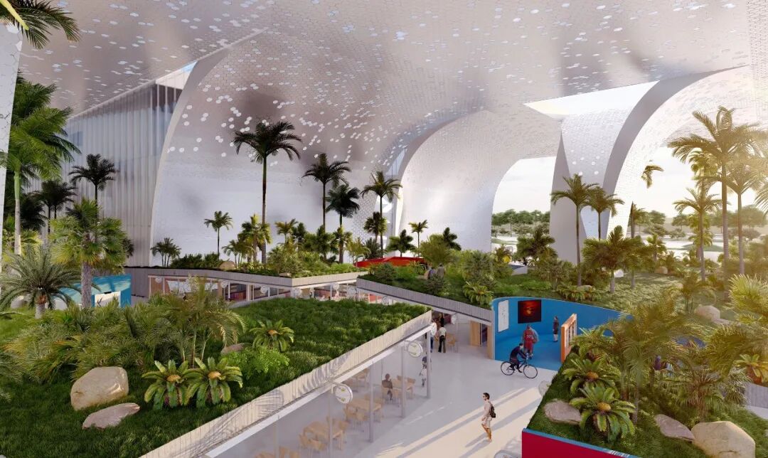我们把多个展馆分为两组布置在公园南北两个区域,借此带动城市不同位置的人气与活力。其中东北角组团集中了三座主要建筑,各建筑之间通过“云廊”连接,围合形成外、中、内多个广场,引导人们进入公园,形成与公园入口共享的公共空间。靠内广场两侧,安排了对外的文化服务设施和休闲场所,闭馆时场地也能成为市民休闲活动的场所。建筑设计立意为“掀起的地平线”,把屋顶下方的内部空间作为景观展现给公众,形成开放而富亲和力的形象。