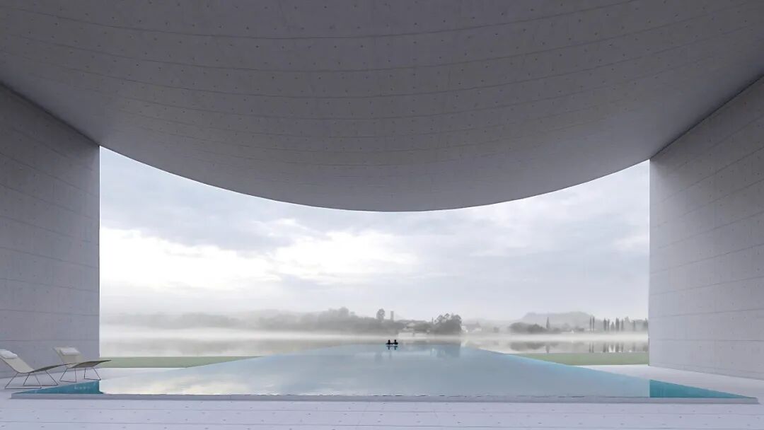我们把建筑化整为零,呈聚落式簇拥流动,向水面伸展,一个个的曲面屋顶如同四川的村落。人们从建筑后部进入,经过前廊、曲墙、内庭院等一系列空间,在建筑的尽头看到景框中的江景,豁然开朗。先抑后扬的空间设计让自然美景成为一种文化体验,抽象而富有诗意。