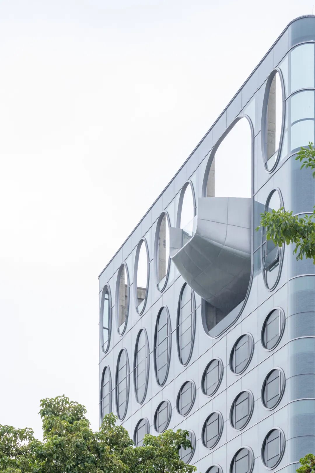 另一方面,我们重点塑造了建筑独特的立面表情,大大小小的圆窗来自于中国园林中的“月窗式”及“鹤子式”窗洞原型,成为一种符号,既关联传统,也面向当代,让建筑的“里”与“外”呈现对望的意趣。建筑大面采用数码打印玻璃描摹砖墙的记忆,圆窗洞内采用超白玻璃,微妙的层次让建筑如水晶般晶莹剔透。