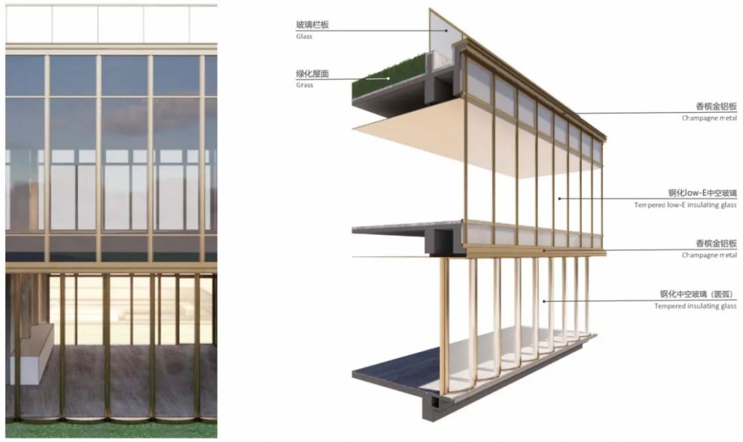 康养类建筑对于玻璃幕墙的应用限制比较明确,因此在细节上采用类幕墙的节点设计,通过精细的金属型材收边勾勒,达到理想的设计效果。