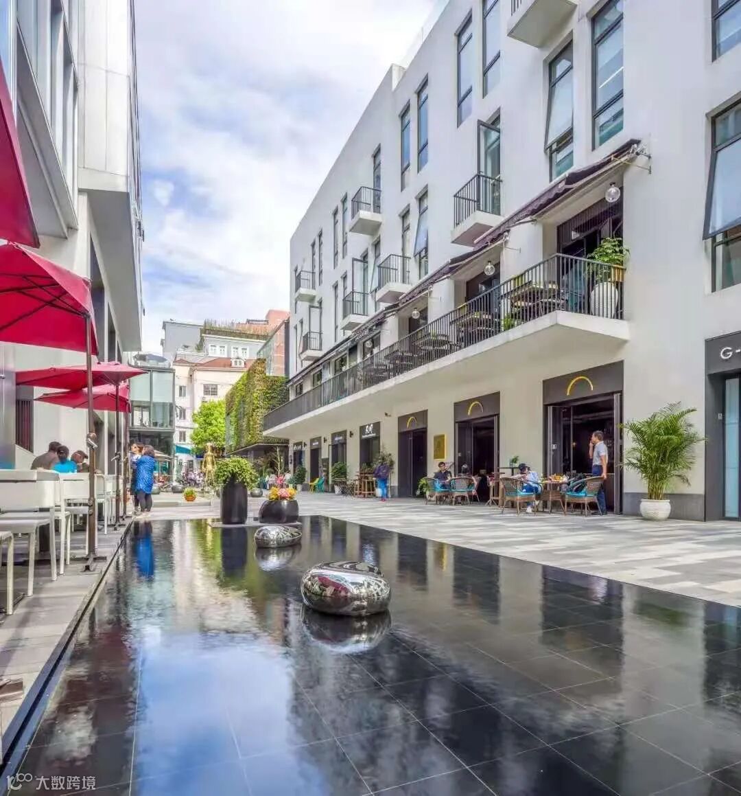 项目通过拆除围墙和大门,将幸福路和番禺路连通,不仅为周边居民打通了一条开放的步行道,而且两侧分布了43家不同类型的商铺,包括了品牌咖啡馆、酒吧、蛋糕店、健身房,搭配棱角分明的冷色建筑装饰,整个街区显得新潮且活力十足。