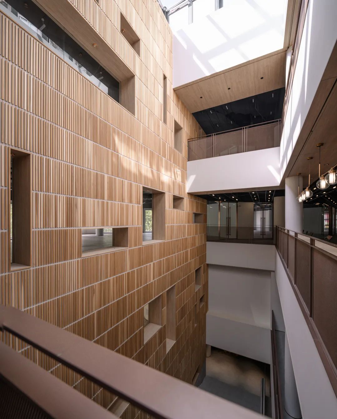 建筑内部改造,则从功能实用性出发,重新打开了原始建筑设计的屋顶天窗,自然光线透过天窗均匀的洒进来,似薄雾又似水幕划分了空间,既为空间增添了活力,又为萦绕中庭的开放式交谈区和四周的办公空间区域提供了良好的采光。