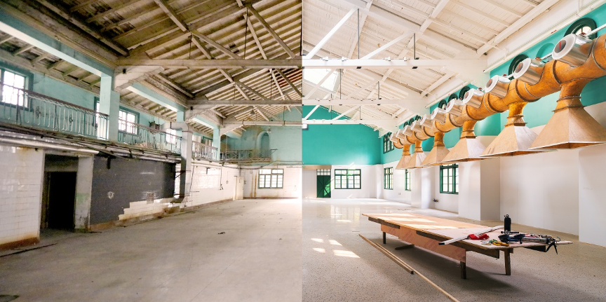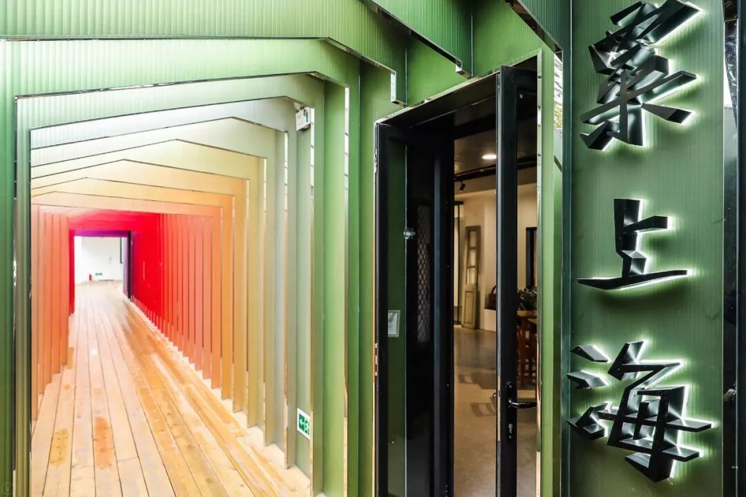 海军俱乐部外观上,修复并延续了与哥伦比亚乡村俱乐部一脉相承的西班牙传教风格。室内,则保留了上生所将其作为培养基蒸锅间时的白色木屋架、绿色内墙面的基调,同时,当年的除尘罩斑驳的锈迹清晰可见,但已被巧妙地改造为空调风口。