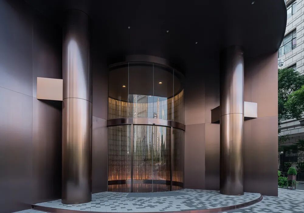 设计从城市风貌角度延续了南外滩区域建筑形象的整体性。在外立面上采用石材饰面,通过创新宽窄相间又极富有韵律的立面组合,玫瑰金入口及圆形水晶门厅,以及连接城市霓虹和黄浦江景的屋顶花园,使得滨江生态景观与新海派建筑风格相映成辉。将这处建于90年代中期的老旧写字楼,转化成为一个开放、交流、共享的新型办公休闲社区。