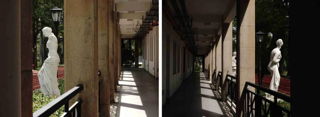 美院标志性的“徽章”—— 红色跑道和雕塑走廊,翻新后成为最有校园氛围感的打卡地。大卫、思想者、断臂维纳斯、伏尔泰、高尔基……这些出自艺校师生之手的临摹雕塑与林荫跑道,晨曦残阳树影曼妙,在地面勾勒出光影的艺术之美。