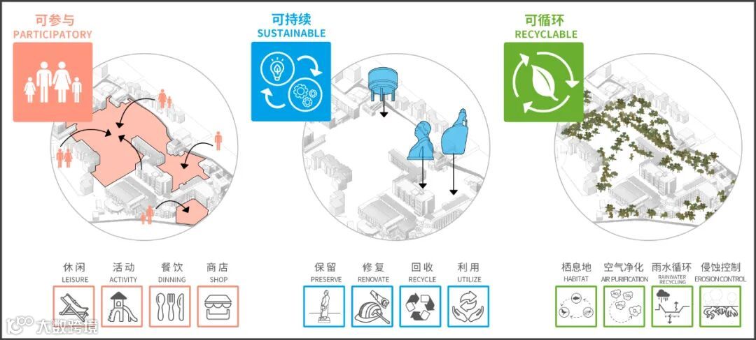 设计团队基于前期的现场勘查与调研分析,本案景观提升设计以“尊重延续场地文脉、增强社区互动性和场地的公共可达性”三大理念为主题,以低成本、低干预的方式修复校园。