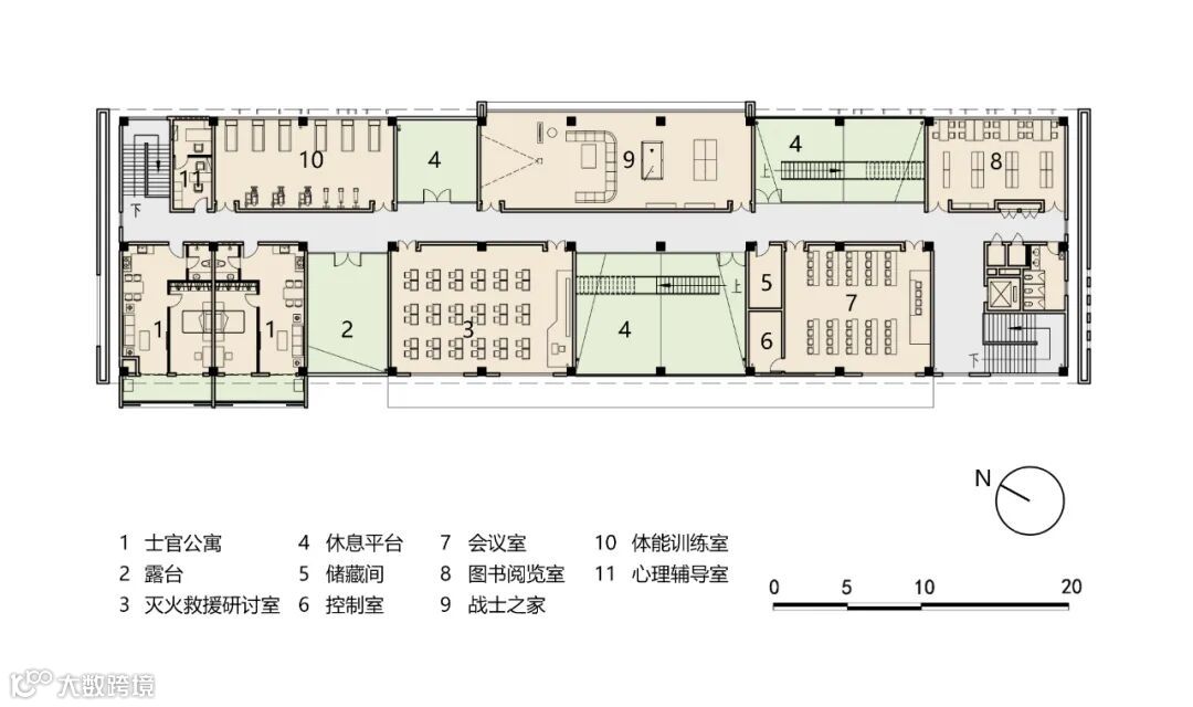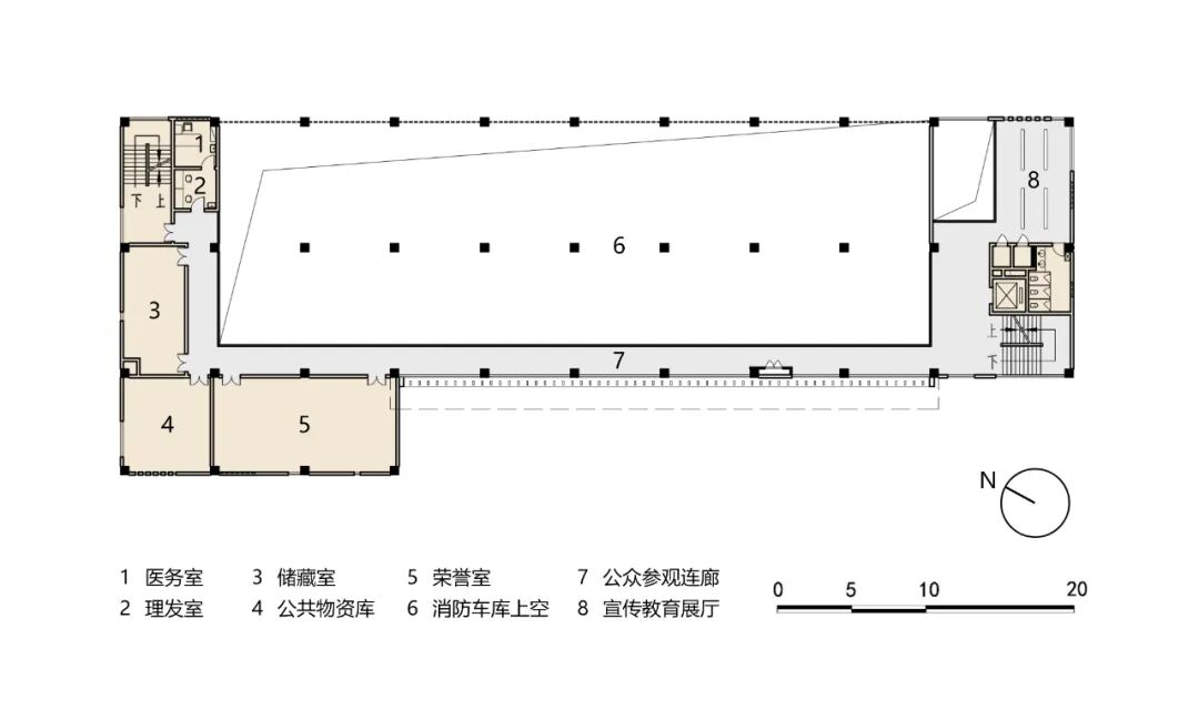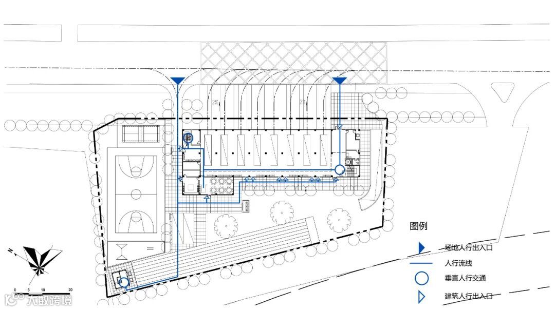北站消防站的东南侧为主出入口,消防员和参观者由此进入消防站。市民周末和节假日参观时,通过楼电梯到达夹层连廊,参观消防车库和车库屋顶的绿化果园,并可俯瞰训练场地。预约参观时,可通过一条完整流线将开放区参观完毕,封闭区与开放区连接处均设有管理口,做到完全不影响消防员日常训练及出勤。