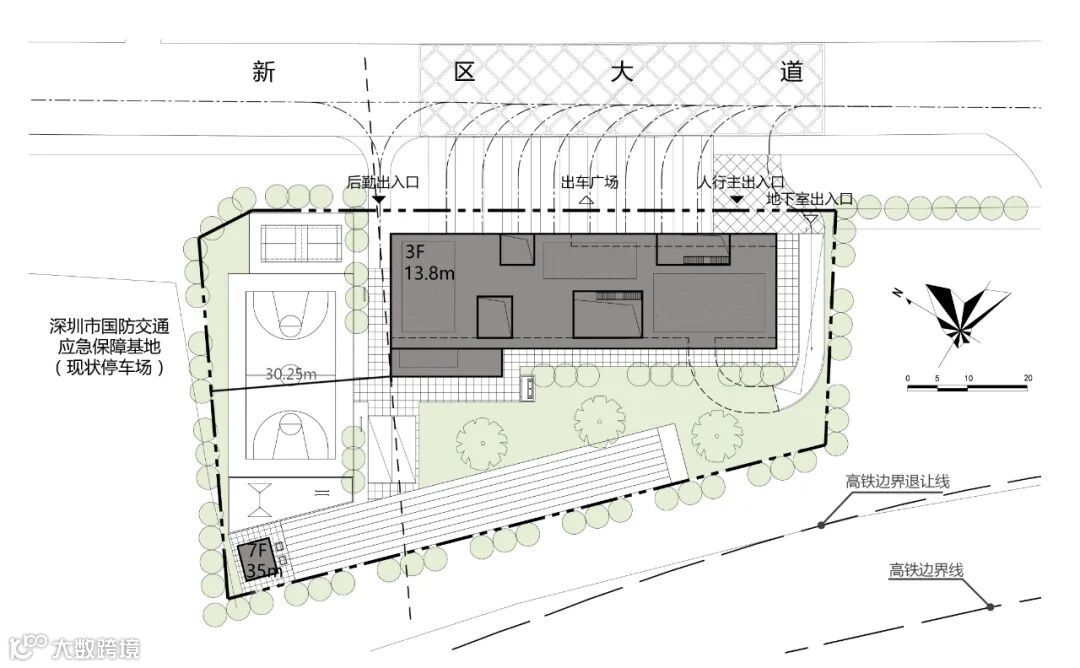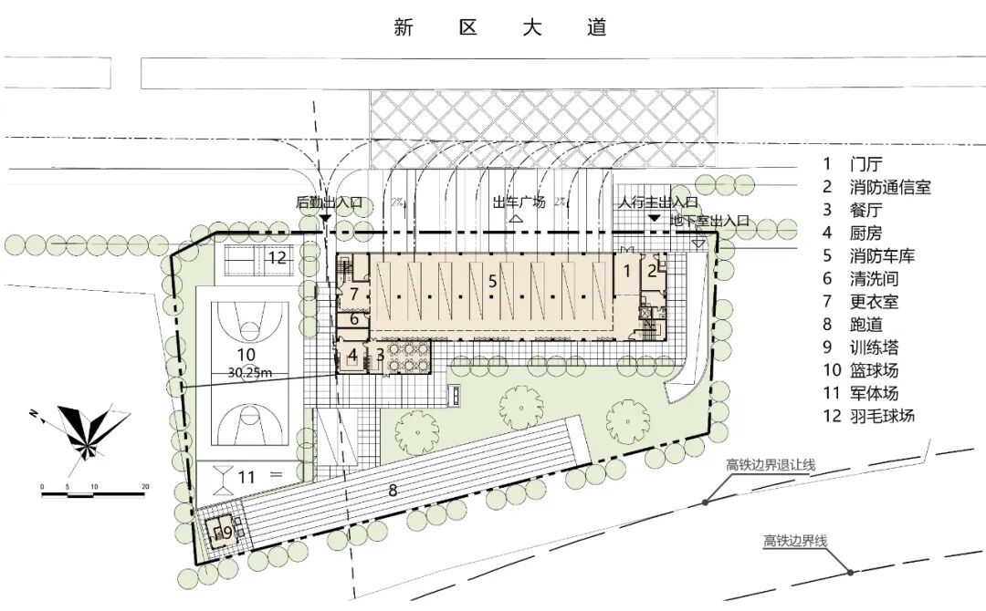 地块东侧与新区大道相邻,是场地主出入口的开设路段。东侧设消防车库出车口及出车广场,供消防员出警、回车用,东南角为人行主出入口,供消防员和参观人行进入。北侧的次入口是后勤出入口。我们将训练场地、跑道和篮球场设置在西侧、南侧,以此来应对铁路噪音干扰及深圳市国防交通应急保障基地特殊退线的挑战。
