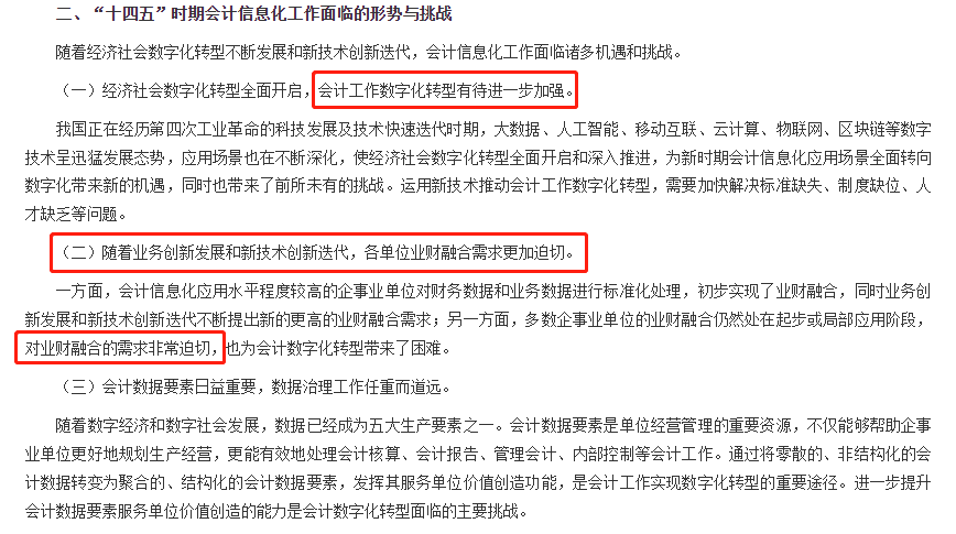 通知表示“经济社会数字化转型全面开启,会计工作数字化转型有待进一步加强。随着业务创新发展和新技术创新迭代,各单位业财融合需求更加迫切。 ”