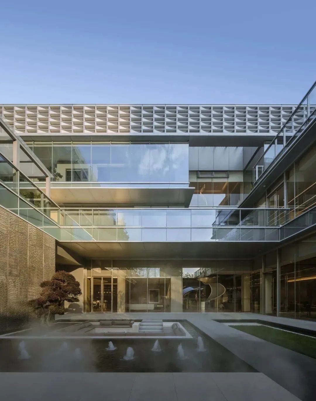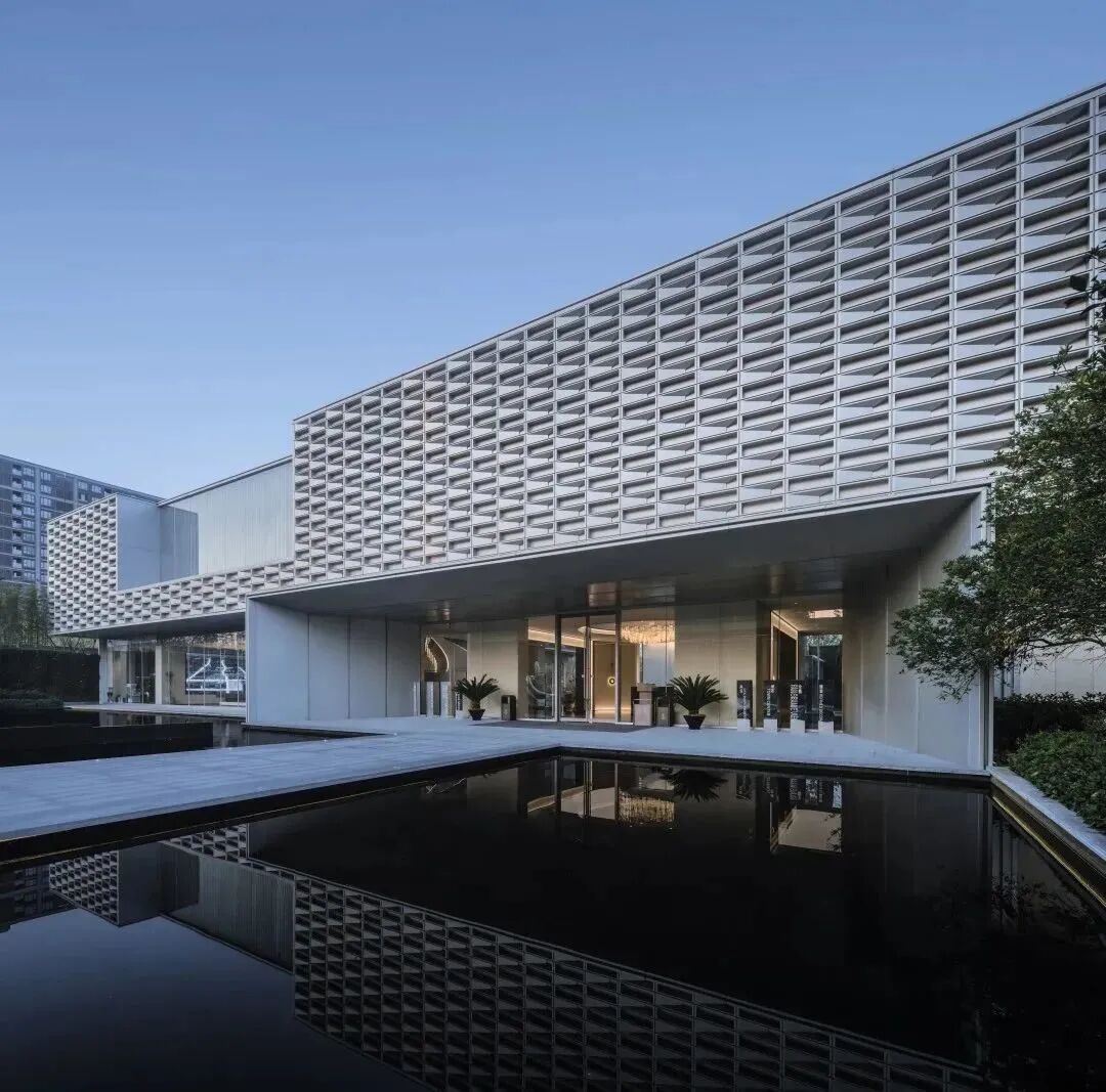 穿越入口转折门廊,序列铝板单元映入视野,水景自入口延续至内庭院,风帘翠幕,菱歌泛夜;两种形式的单元阵列给人以秩序感之美,入口的斜面形式,以迎接的姿态等候来访者。