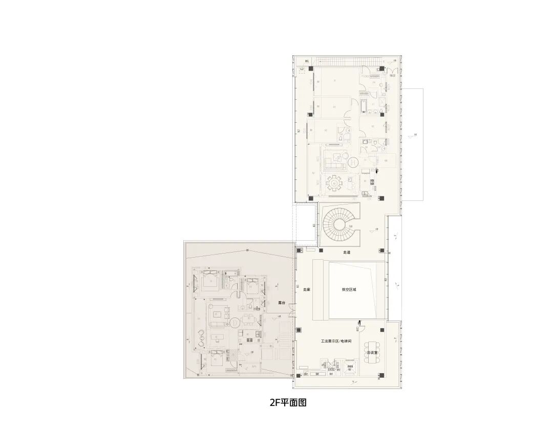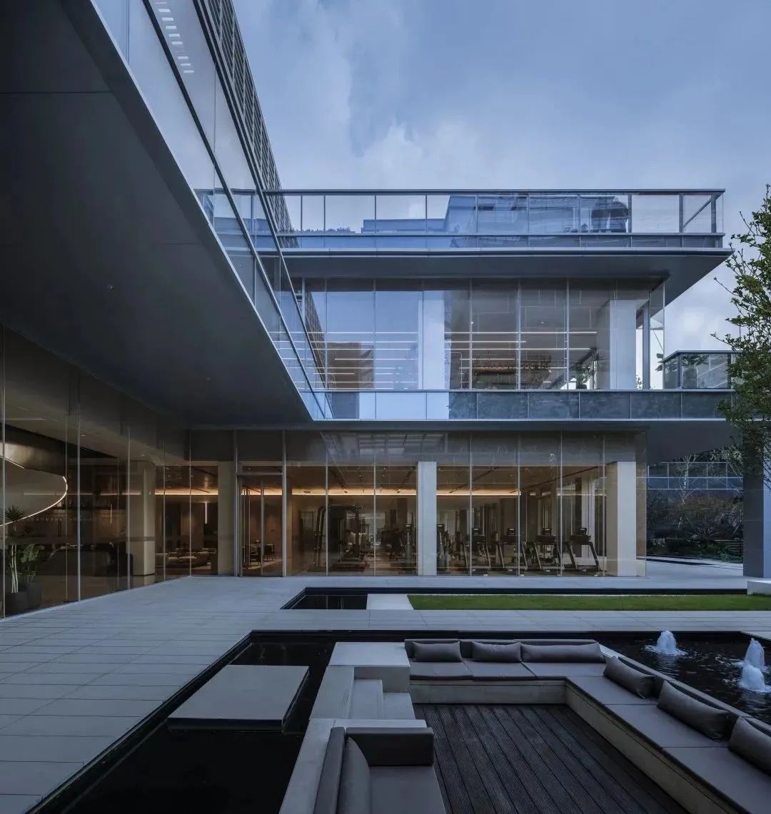 一层、二层前期作为售楼部接待,后期为物业用房,承载快递收发、物业服务等便民服务功能;地下一层为健身会所、恒温泳池、瑜伽房与私宴厅,直通下沉庭院,L型布局最大程度将室内与室外景观相融合;每层均有室外露台空间,层层错动,优享闲适,与景观活泼对话。