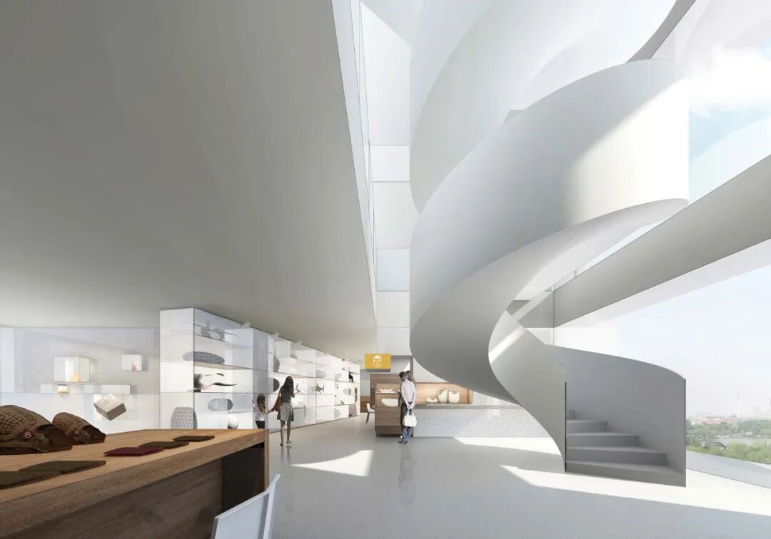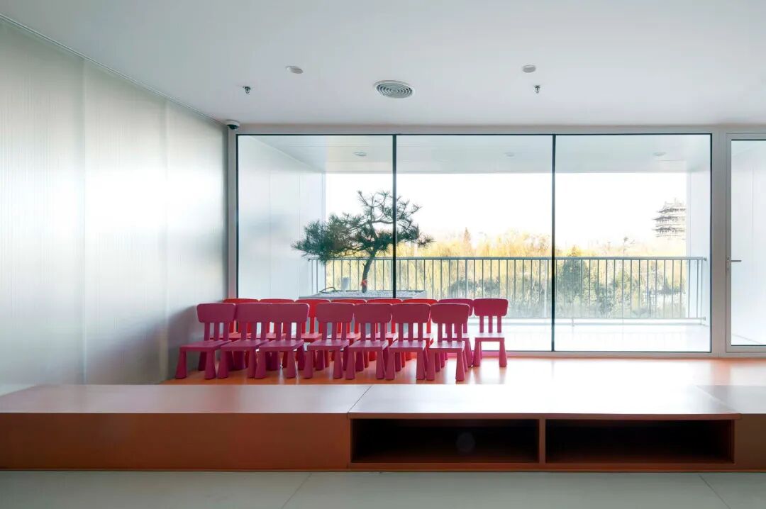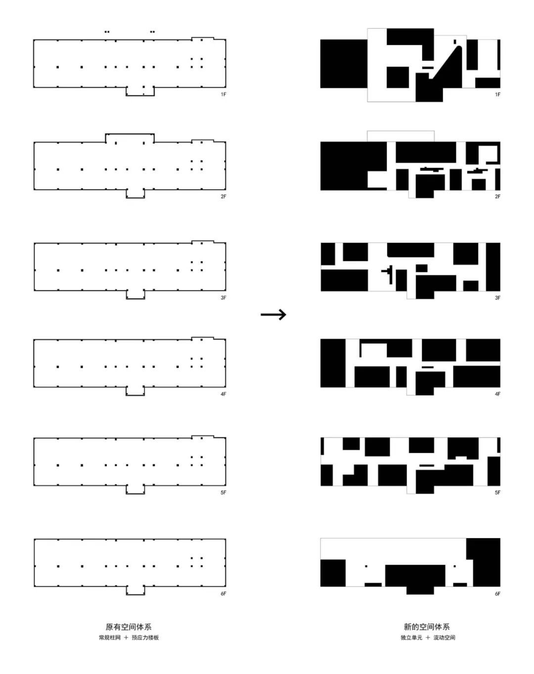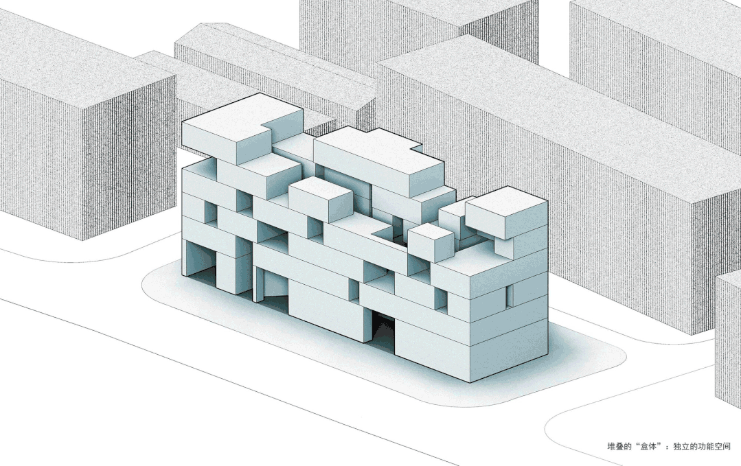 We separate some relatively independent and closed functions to form multiple independent "boxes", which are freely stacked, staggered, and squeezed within the framework of the six-storey space, blanking the homogeneous structural columns, and breaking the horizontal limitation of the floors.