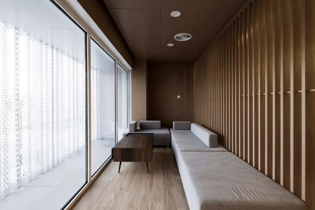 The punched aluminum panels as windows of independent space, and together with the blank-leaving among the "boxes", are superimposed on the facade, forming staggered layer imprints of different sizes. At the same time, the public part has become more open.