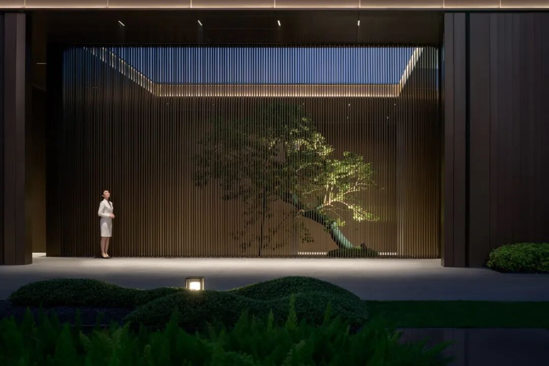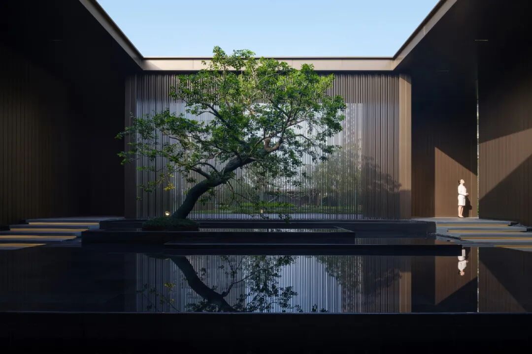礼仪水院中造型铁冬青,是整个庭院空间的视觉焦点,也是传统文化中“天人合一”的精神所在,静谧、雅致,充满东方意境。同色系的格栅,疏而不漏,通而不透,阳光透过格栅撒进水院,将朦胧之美演绎到了极致。