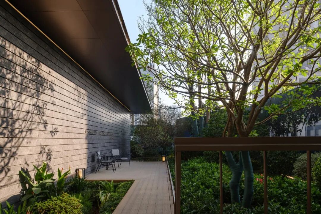 极具构成感的林下洽谈区让一切回归生活的本真,灰色软装家具搭配暖色木平台,极简又高级。