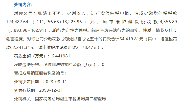 行政处罚决定文书号:湛税二稽罚〔2023〕14号